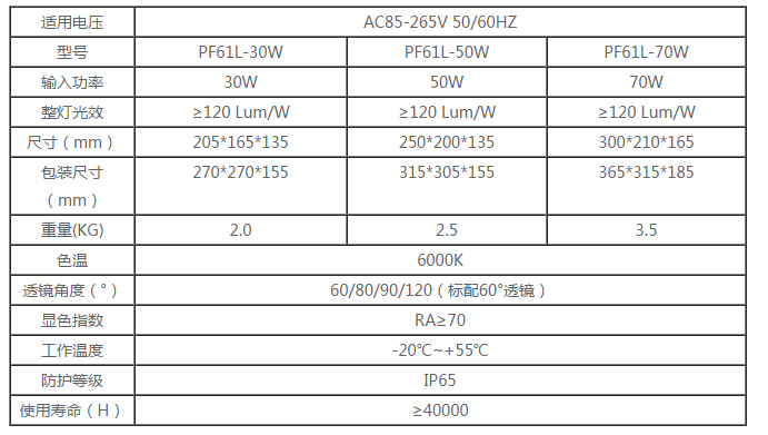 LED投光灯PF61L主要参数