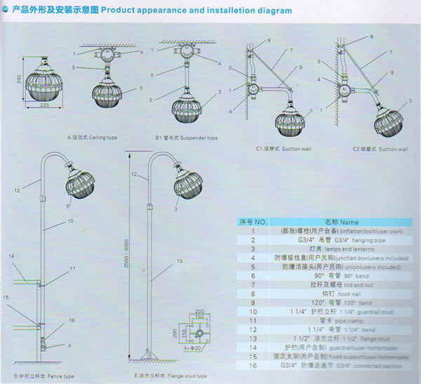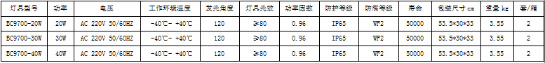 小功率LED防爆灯BC9700-40产品图: 产品主要特点 光学系统特点 采用进口芯片,点阵式灯珠结构,具有优异的光通维持率及高光效 采用表面SMT贴装技术,大幅度提高导热性能 精心设计蜂窝状配光结构,有效提高灯具的效率 驱动系统特点 采用恒流驱动,具有短路、过压保护功能 具有优良的电磁兼容性,不会对其他电器、输电网络造成任何干扰,电源自身具有优良的抗电磁干扰能力,具有宽电压兼容特性, 散热系统特点 精心设计三腔独立结构,确保各电子元器件稳定工作 精心设计具有空气导流结构的散热导风槽,确保LED光源的使用寿命 精心设计独立的电源腔结构,电源工作不受LED热量的影响,保证工作的稳定长寿 整灯结构特点 采用ⅡC级防爆结构,及IP65防护等级,具备优异的防爆防护性能 采用高硼硅化玻璃,可耐受高温能量的冲击 全部外露紧固件及其附件均采用高防腐蚀性能的不锈钢材料制成 采用接线腔独立开盖的连接方式,方便用户接线与维修;多种安装方式供用户选择 可选防眩透光板配件 适用范围 广泛用于石油开采、炼油、化工、军工等危险环境及海洋石油平台、油轮等场所作普通照明和作业照明之用; 适用于节能改造项目及检修更换困难的场所; 适用于防护要求较高及潮湿的场所; 适用于爆炸性气体环境的1区、2区场所; 适用于ⅡA、ⅡB、ⅡC类爆炸性气体环境; 适用于T1-T6组温度组别; 安装示意图 配光曲线 led防爆灯技术参数