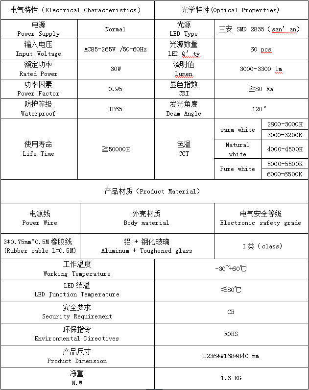 PF73L-30W产品特点(Product features): 1.配合恒流率电源,显色效果和亮度更出色; 2.了铝基板面积,可以快速将热量传给壳体,增加了灯具的导热效果 3.盖咬合设计有效防止侧边漏光; 4.等级IP65 PF73L-30W产品规格(Product Spec):