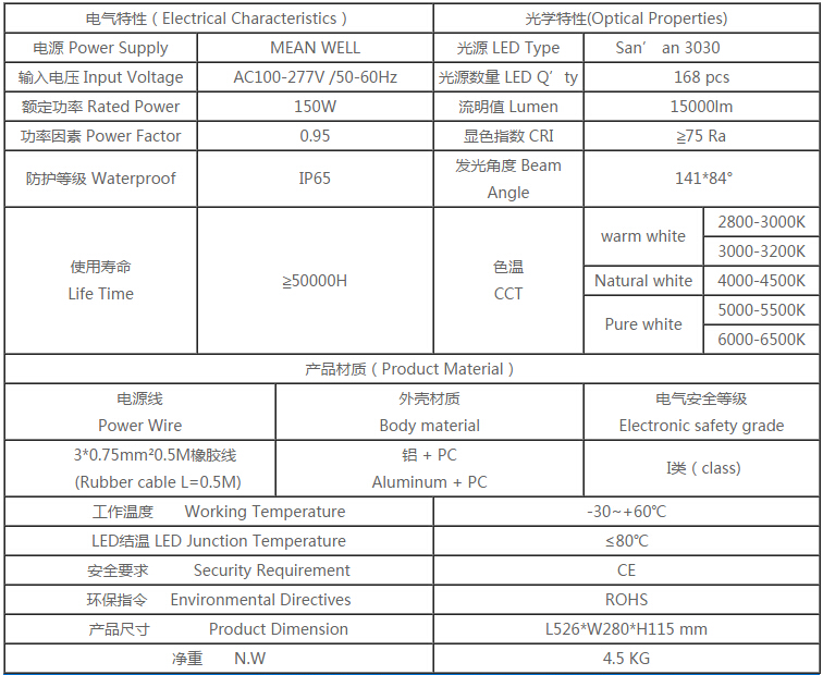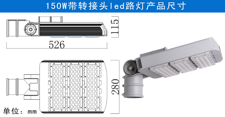 产品特点: 1.灯臂角度可180°调节,照射角度可随意变化 2.采用高亮度LED芯片,亮度高、显色性好 3.铝加工而成,对流散热设计,散热性能好,保障光源使用寿命 4.抗17级风力,无形变、松动等现象,异常牢固 5.防护等级IP65 适用范围: 主干道路、高速公路、高架路、市区街道、天桥、人行道等道路照明,以及广场、学校、住宅区、工业区、公园等其他需要户外照明的场所。 产品规格(Product Spec):PL29L-150W LED路灯