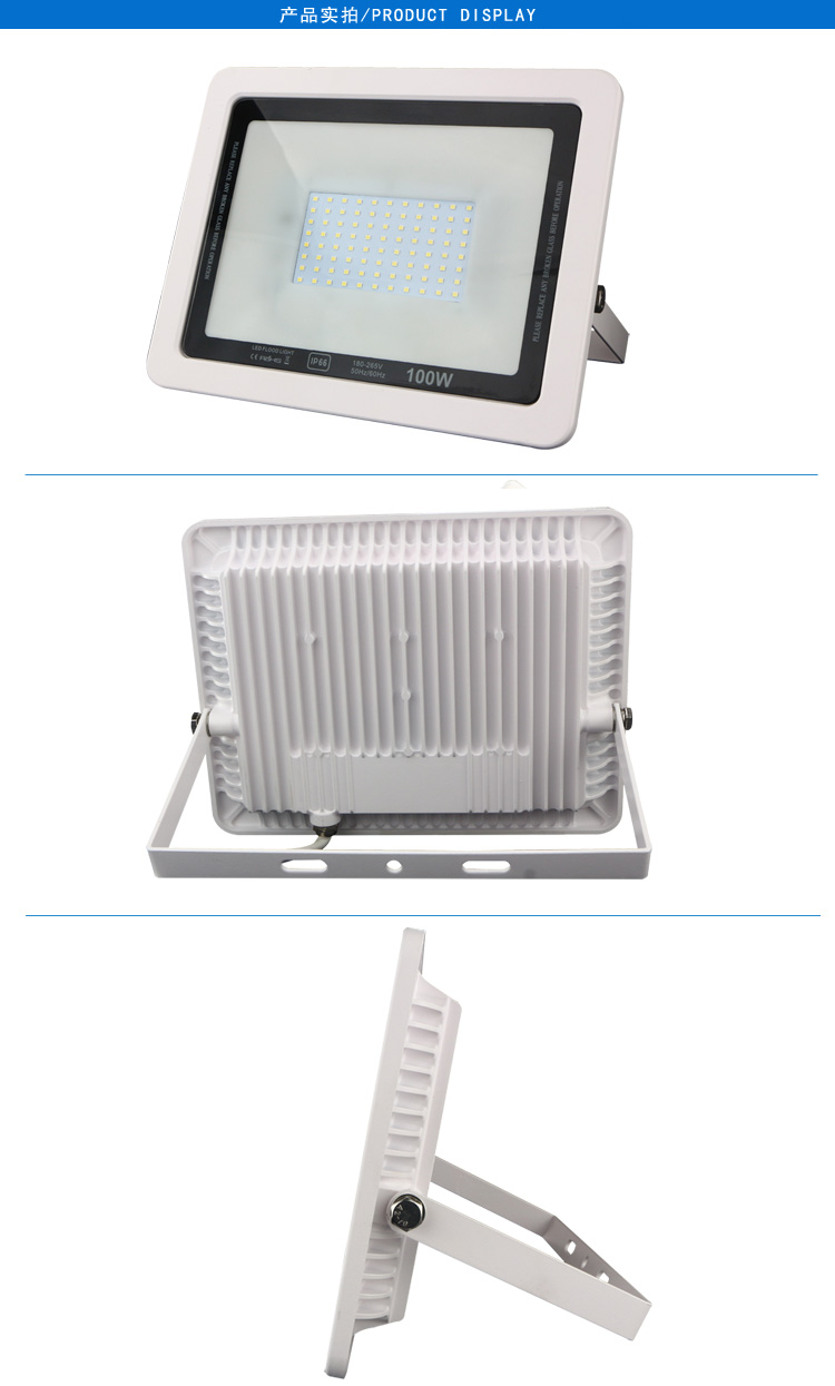 产品特点: 1.钢化玻璃面板,高强度保护光源,透光率达95%; 2.压铸铝一次成型,防尘防水,防护等级IP65; 3.灯体外表烤漆处理,不易刮花 适用范围: 适用于户外广告牌、体育馆、建筑外墙、绿化、庭院、公园等照明场所